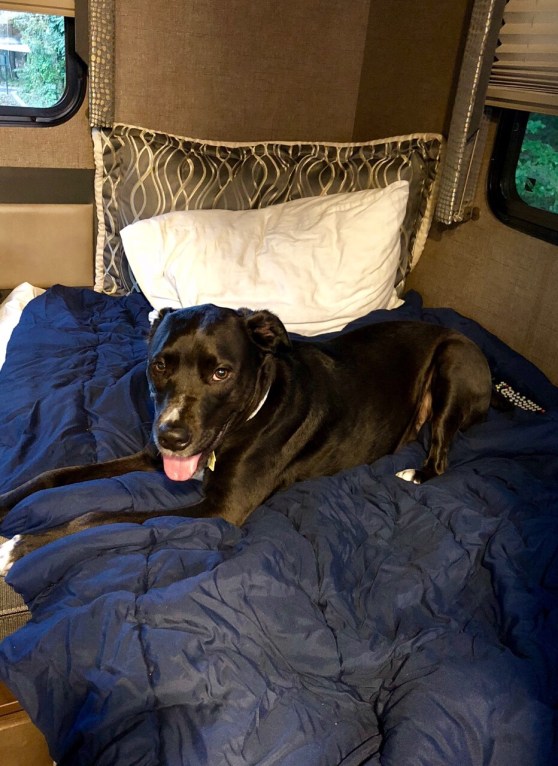 Yogi was glad to see us back at camp. So much so that he barfed a big wad of welcome grass on my bed spread! Poor guy. Riding in the motor home as it rattles and shakes around still makes him nervous. I guess all three of us are out our element. Hmmm… Our emotional state is easily affected by our surroundings and our surroundings are affected by our emotional state. Result? Puke on my bed!